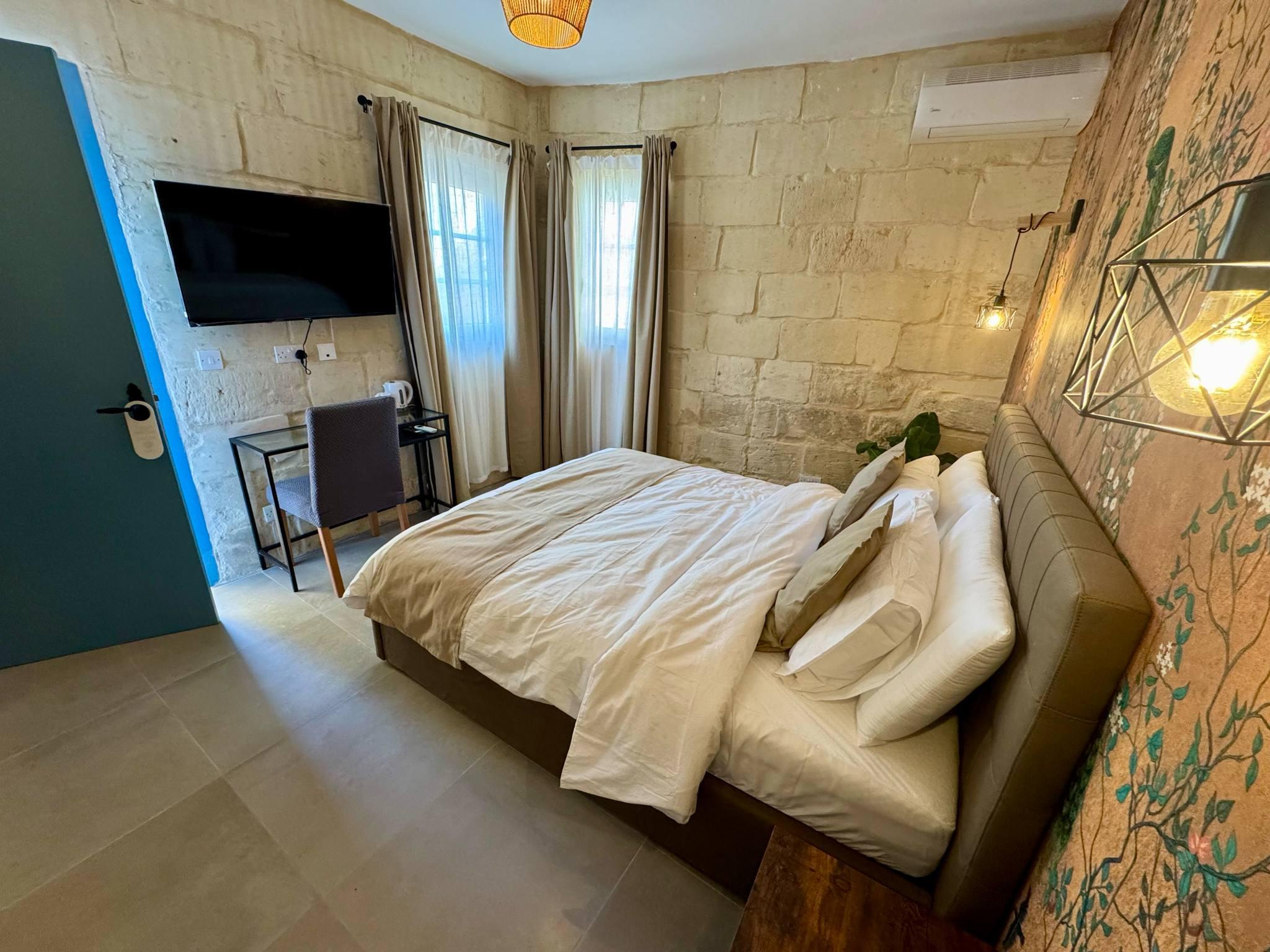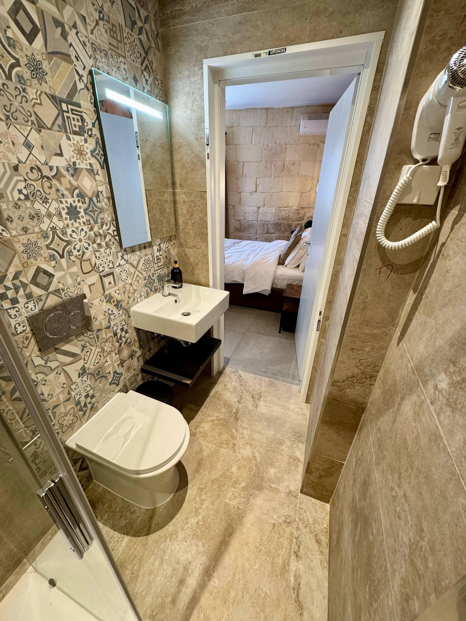 Room 7, known as Il-Kamra tad-Dawl (The Room of Light), is a beautifully designed double room that combines fresh architecture with the timeless character of Kappella Boutique. This room is newly built on the footprint of the original chimney of the old bakery oven, and has been carefully restored using traditional Maltese stone. The room is filled with natural light thanks to its two windows overlooking the internal courtyard, creating a bright and uplifting atmosphere throughout the day. From the windows, guests can also enjoy a charming view of the nearby chapel dome, adding a peaceful and distinctly local touch to the space. Inside, the room blends authentic Maltese limestone with clean, modern finishes, offering a calm and elegant environment. The balance between traditional materials and contemporary design makes This roomis both comfortable and characterful. It also includes a comfortable double bed, air-conditioning, TV, and free Wi-Fi, ensuring a relaxing stay with all essential modern amenities. The private ensuite bathroom is modern and thoughtfully designed to complement the room’s overall style. Located on the first floor and accessed via the courtyard stairs, Room 7 is ideal for couples or solo travellers seeking a peaceful retreat filled with light and authenticity. Its quiet courtyard setting and unique historical background make it one of the most serene rooms at Kappella Boutique. Il-Kamra tad-Dawl offers more than just a place to stay—it offers a bright, calming space rooted in history and reimagined for modern comfort.